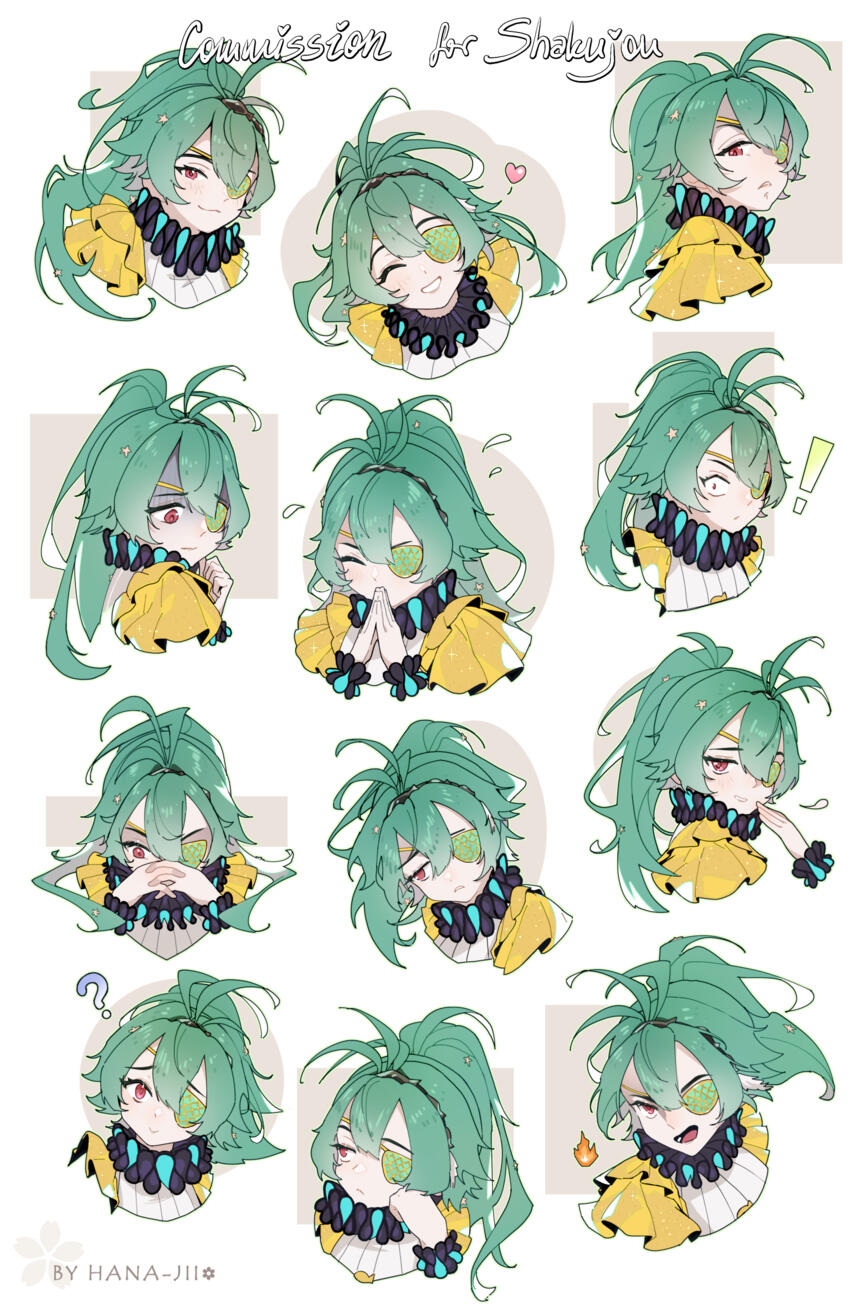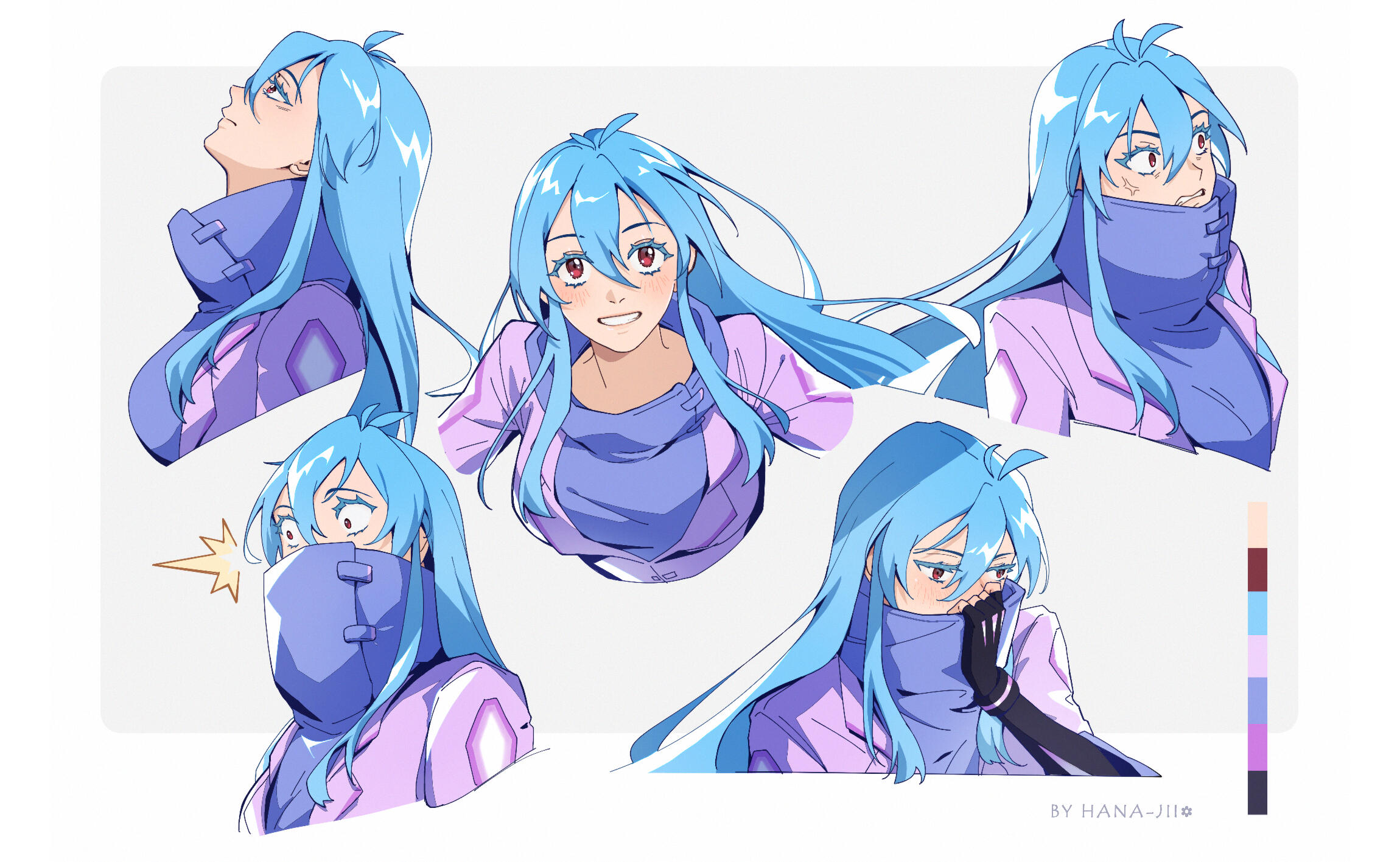| expressions, chibi, half body, props, color scheme, illustration, sketch, companion, outfit variation |